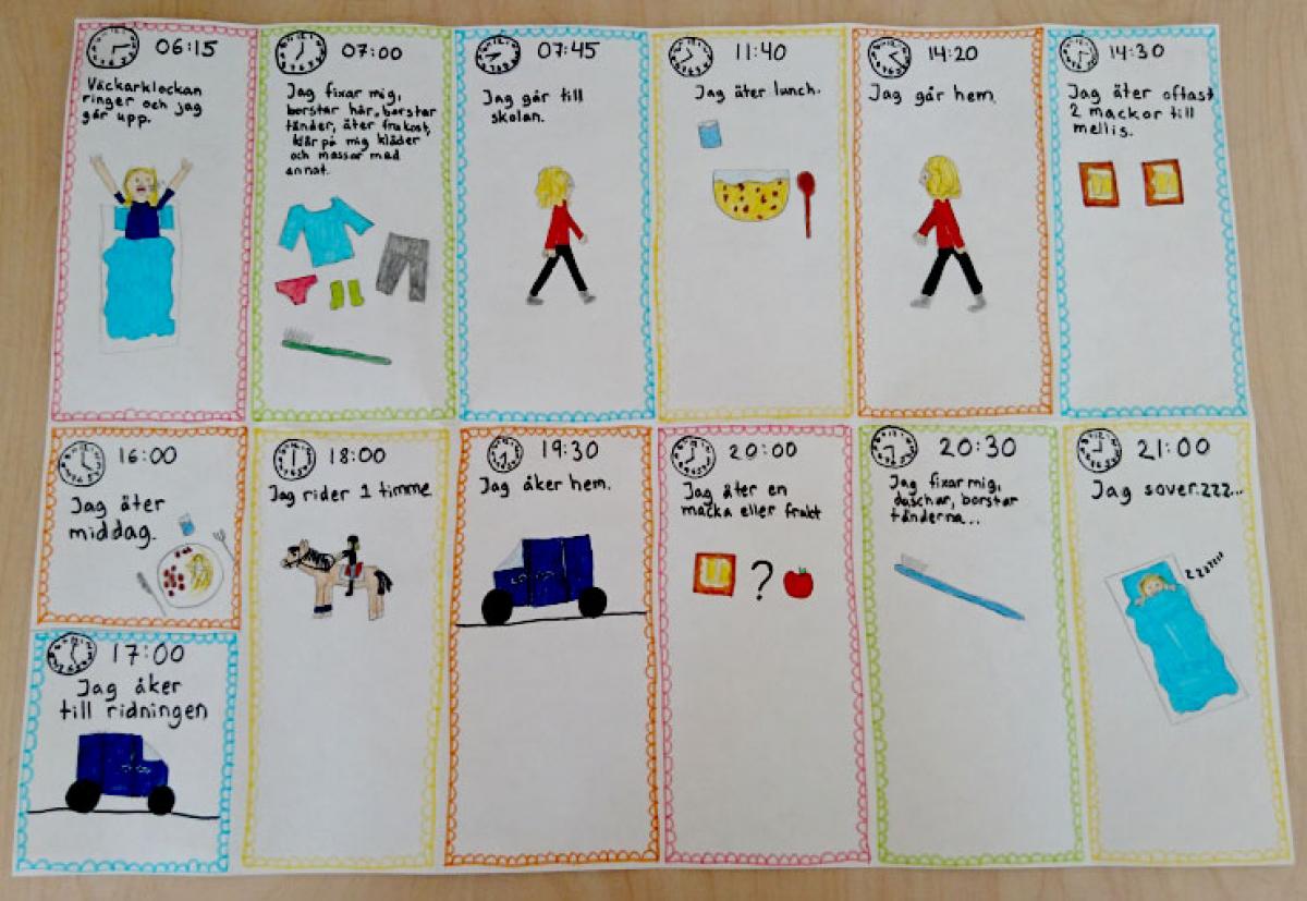En elev i svensk skola har gjort en ritning över sin egen dag i livet. Dina elever kan också teckna, eller ta bilder och skriva.